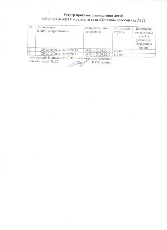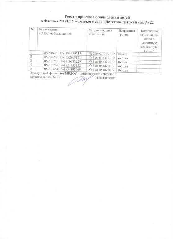 Реестр приказов зачисление детей филиала МБДОУ-детского сада Детство детского сада № 22 на 07.06.2019г.