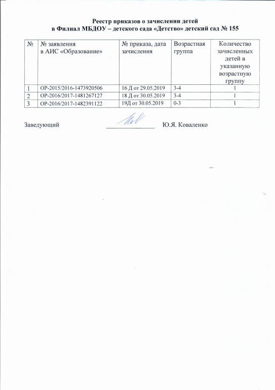 Реестр приказов зачисление детей филиала МБДОУ-детского сада Детство детского сада № 155 на 06.06.2019г.