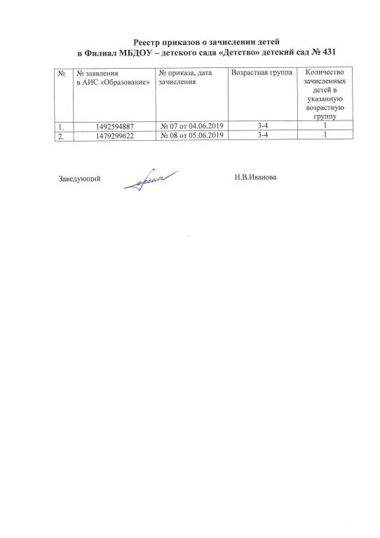 Реестр приказов зачисление детей филиала МБДОУ-детского сада Детство детского сада № 431 на 06.06.2019г.