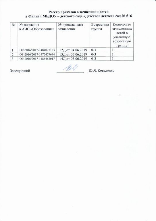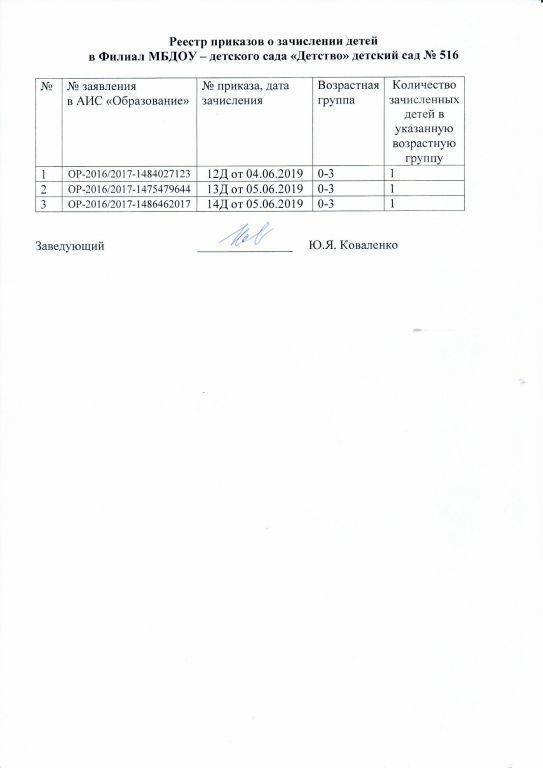 Реестр приказов зачисление детей филиала МБДОУ-детского сада Детство детского сада № 516 на 06.06.2019г.