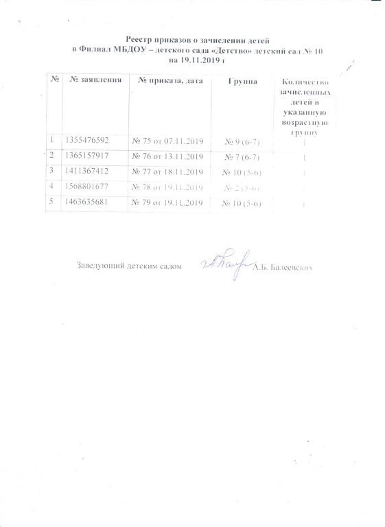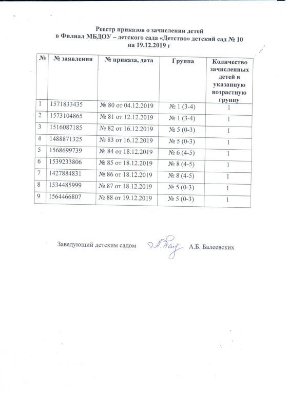 Реестр приказов о зачислении детей в филиал МБДОУ-детский сад Детство детский сад № 10